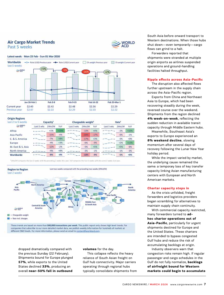 Within hours of the first strikes on Saturday, 28 February, retaliatory action from Tehran targeting major Gulf aviation hubs forced the closure of several airports across the region. Airlines based in the Gulf temporarily grounded fleets, resulting in a sudden withdrawal of a significant share of global cargo lift. According to analysis compiled by WorldACD Market Data, nearly half of all airfreight capacity originating in the Middle East and South Asia (MESA) was effectively stranded over the weekend, equivalent to roughly 15% of global air cargo capacity.