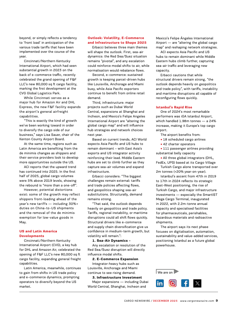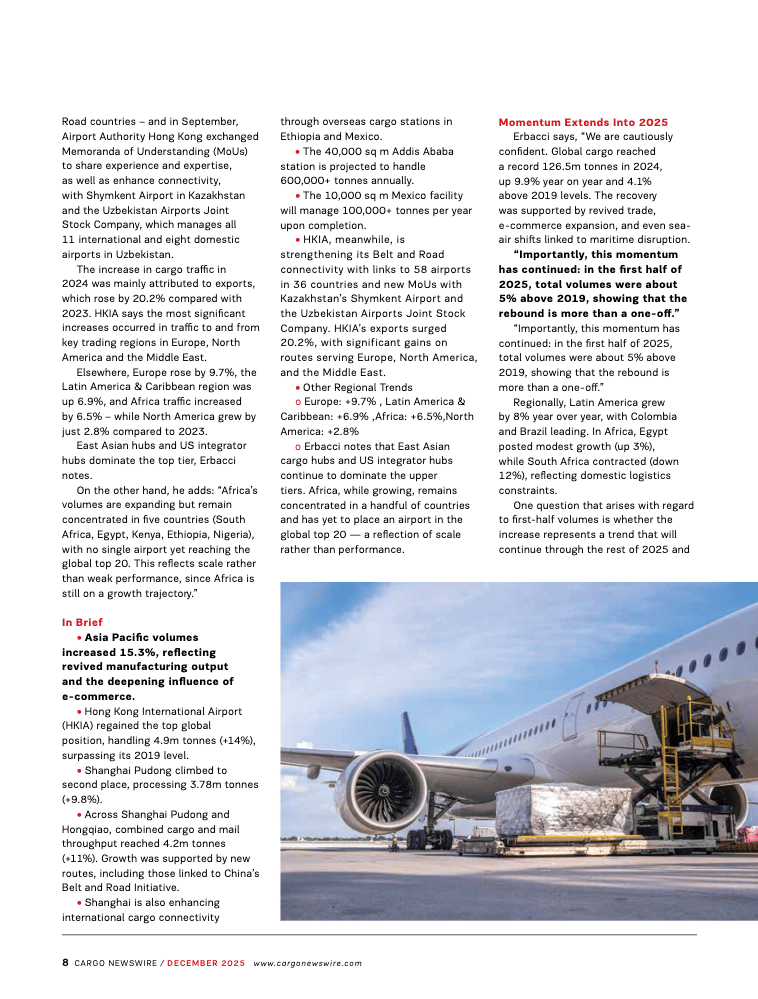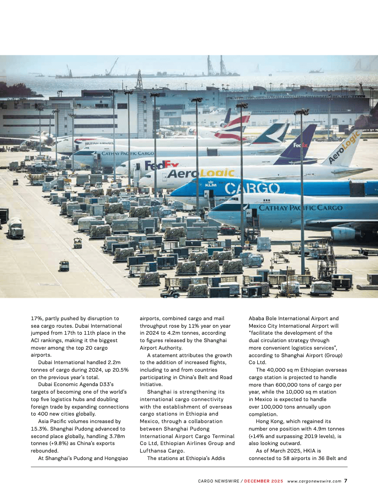 Airports Council International (ACI) World has released the 2025 Edition of its World Airport Traffic Dataset, confirming a decisive rebound for global air cargo in 2024. While the rankings revealed few surprises, the data underscores the industry’s resilience amid a turbulent geopolitical and economic landscape. ACI World director general Justin Erbacci says the traffic figures “reflect the scale of global aviation and the resilience of the industry that continues to grow, despite the complex global environment”. of a market “clustered around a small group of airports that act as integrator superhubs, transhipment gateways or key export nodes”. Despite notable growth in Latin America and Africa, the overall market structure remains “highly consolidated”.