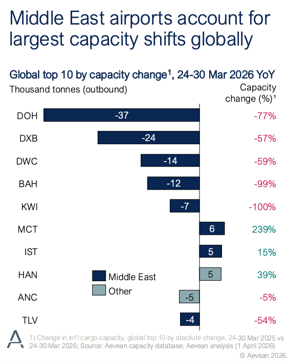 Tags: Aevean aviation research.airport cargo capacity shiftsairspace closures logisticsaviation fuel impact air cargoDoha cargo capacity dropDubai air cargo marketglobal airfreight capacity 2026global cargo hubs analysisGulf airports cargo declineMiddle East air cargo disruption