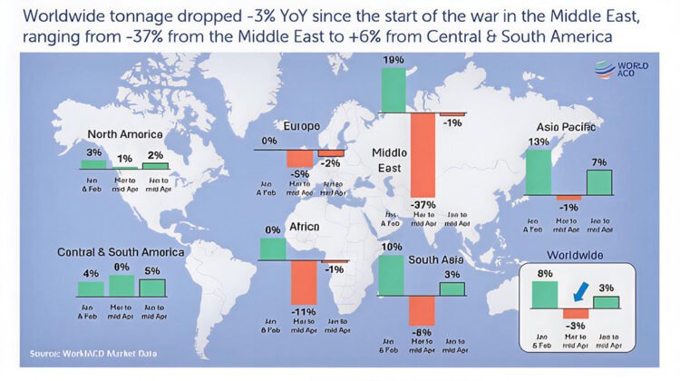 WorldACD’s comparative dataset—tracking January–February performance against the period from March to mid-April, as well as year-to-date figures—illustrates a decisive shift in global air cargo trends. Most regions transitioned from positive growth to contraction following the escalation of conflict, with the Middle East exhibiting the most dramatic reversal.